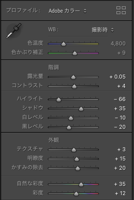 • 露光量/コントラスト: +0.05/+4 と軽めに補正